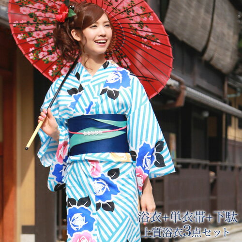 浴衣 セット レディース レトロ 変わり織り浴衣3点セット「白地に水色変わり縞と椿」浴衣 帯 下駄 女性 女性和服 女性浴衣 セット レトロ