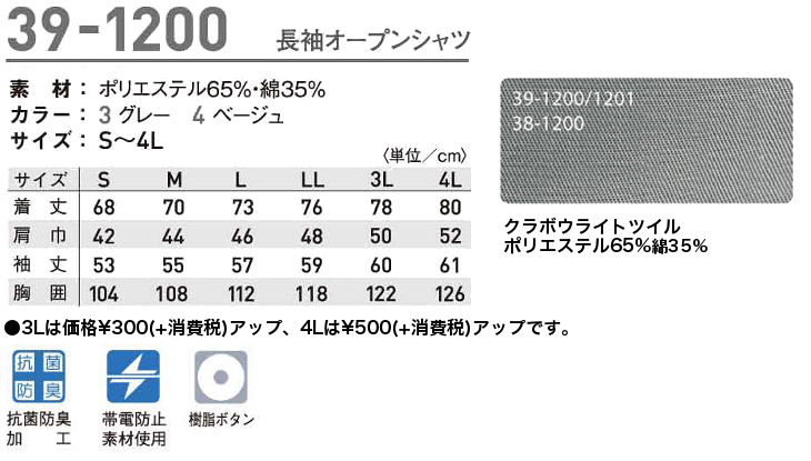 素材 クラボウライトツイル 混率 ポリエステル65% 綿35% カラー 3-グレー / 4-ベージュ サイズ S〜4L ※3Lは通常価格+300円、4Lは+500円アップでございます。